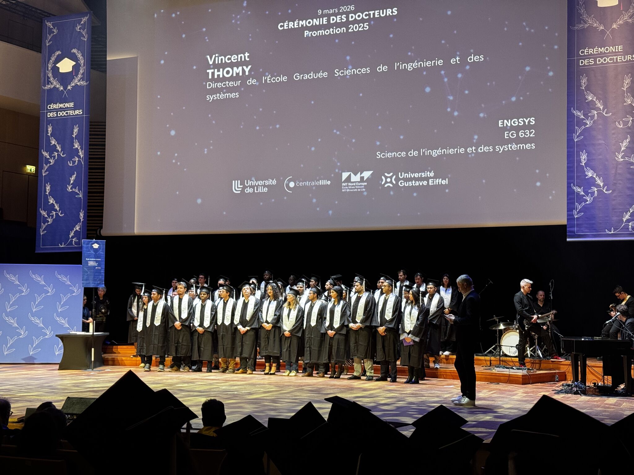 Le lundi 9 mars 2026 a eu lieu la remise de diplômes de docteurs « promotion 2025 » de l’Université de Lille, Centrale Lille Institut, Université Gustave Eiffel et IMT Nords Europe, dans un cadre magnifique, le Nouveau Siècle, et dans une ambiance festive, au cours de laquelle nos jeunes diplômés au participé au traditionnel lancé de chapeau !